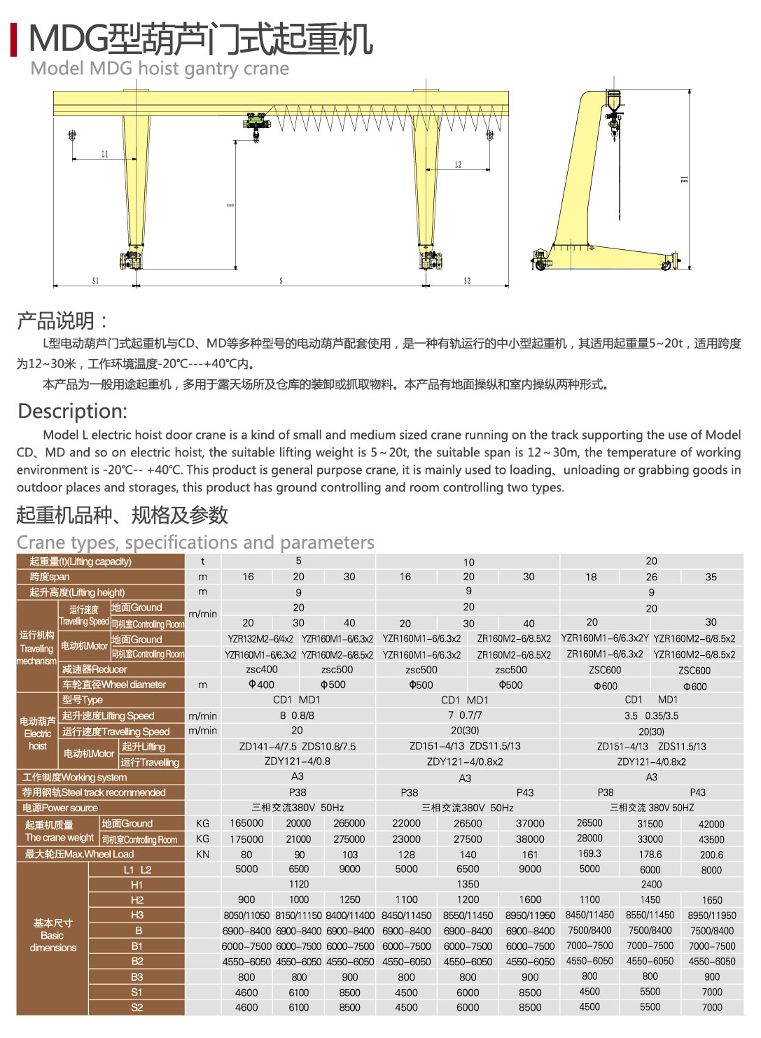 起重量:5t、10t、16/3.2t、20/5t、32/5t、50/10t、75/20、125/20、150/50、160/50等十種規(guī)格;