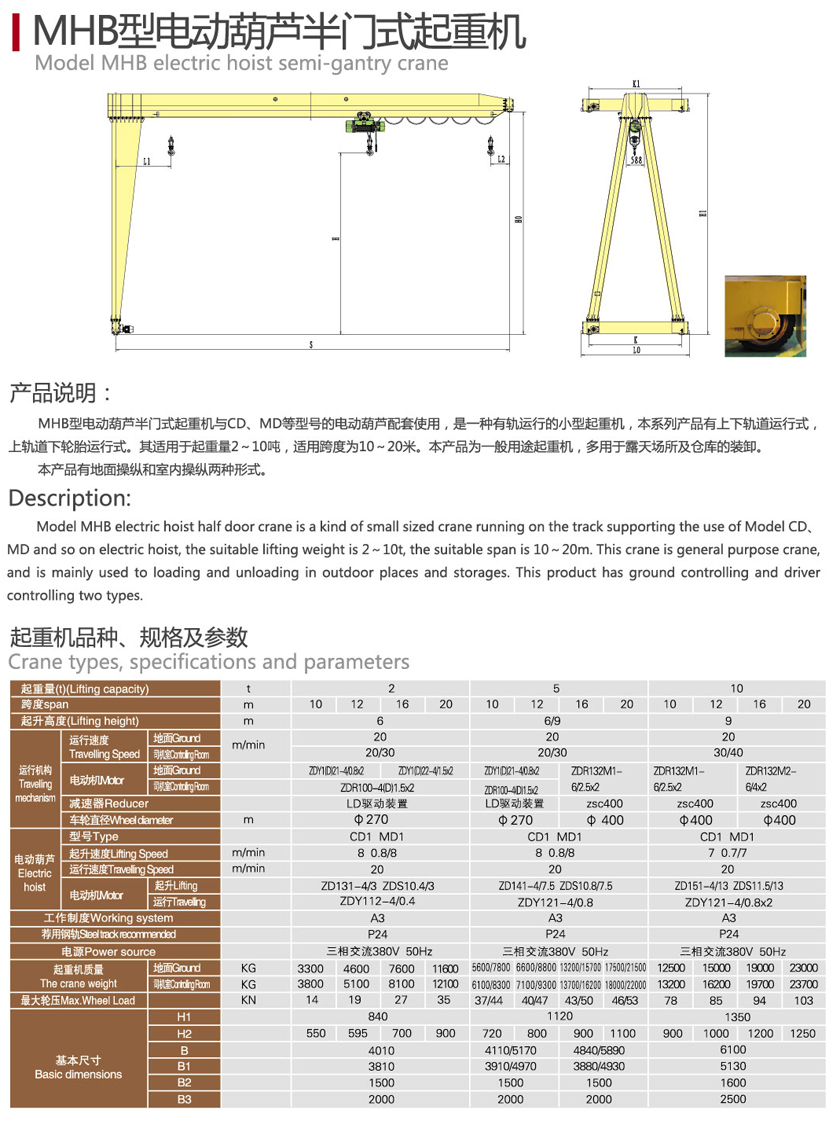 MHB型電動葫蘆半門式起重機為一般用途起重機,多用于露天場所及倉庫的裝卸。本產(chǎn)品有地面操縱和室內(nèi)操縱兩種形式。