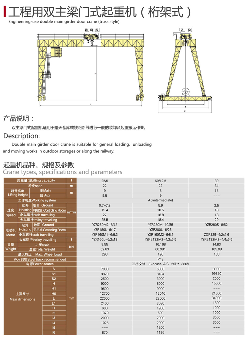雙主梁門式起重機(jī)適用于露天倉庫或鐵路沿線進(jìn)行一般的裝卸及起重搬運(yùn)作業(yè)。