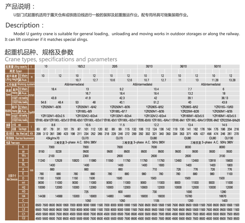 U型門式起重機適用于露天倉庫或鐵路沿線進行一般的裝卸及起重搬運作業(yè)。配專用吊具可做集裝箱作業(yè)。