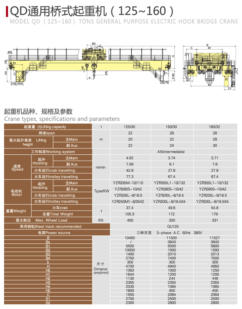 QD型通用橋式起重機-行車屬小車通用橋式起重機,起重機依靠沿廠房行車梁上支承軌道方向的縱向移動、小車的橫向移動和吊鉤的升降來實現(xiàn)工作流程、常用起重量為5-50t,工作級別A5-A7級。操縱方式有地面控制、操縱室控制、遙控三種形式供用戶選擇。A5級適用于工作繁重程度不是很高的一般機械加工與裝配車間、金屬結構車間、機械維修車間等;A6、A7級適用于工作較為頻繁或連續(xù)生產或連續(xù)搬運的場合,還可以作為冶金和鑄造車間的鋪助吊運;其使用環(huán)境溫度在-20-40℃,相對濕度≤85%;另外A7級起重量小于50t的在滿足質檢辦特【2007】375號文件關于新出廠安裝吊運熔融金屬的起重機要求的情況下可用于冶金和鑄造車間吊運熔融金屬,其使用環(huán)境溫度為-20~60℃。本起重機露天使用應注明,以便配套防雨裝置