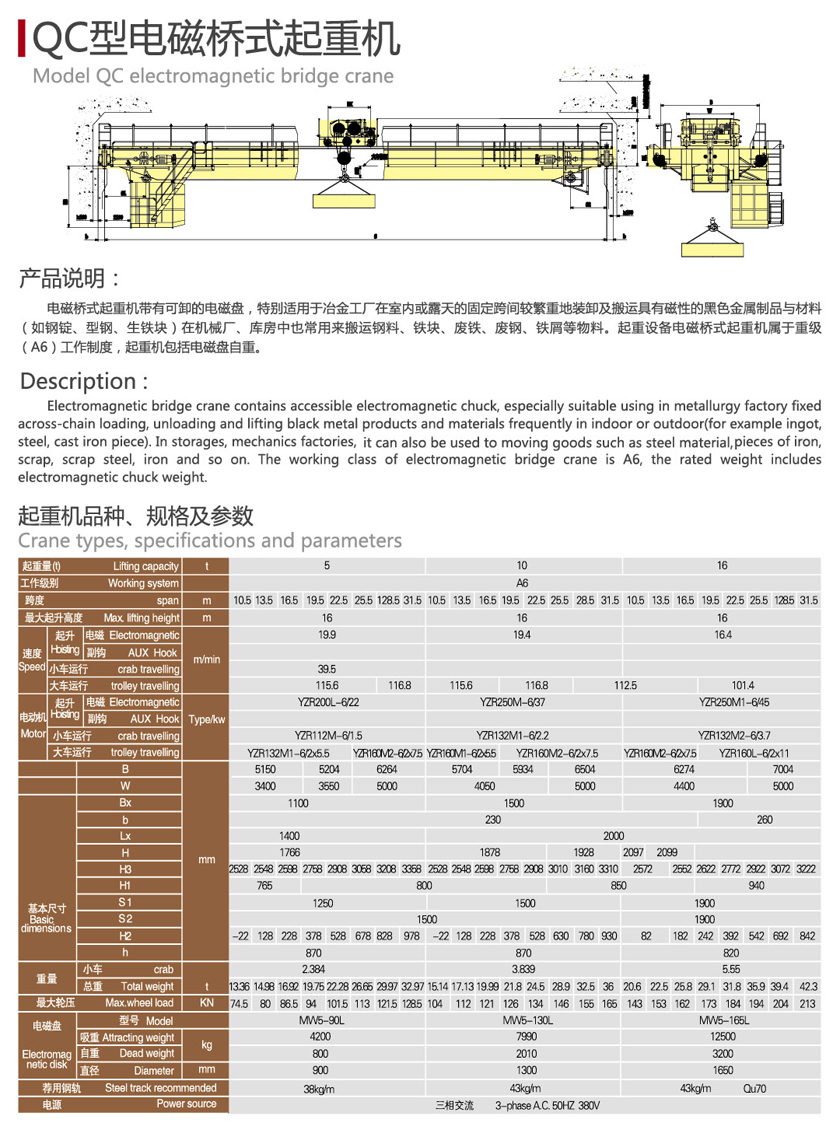 QC型電磁橋式起重機(jī)應(yīng)用范圍:本機(jī)適用于礦山、港口碼頭、鐵路貨站、露天倉庫等物資裝卸和搬運(yùn),并可配備多種吊具進(jìn)行特殊作業(yè)。