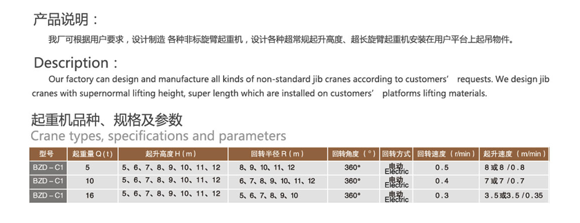 我廠可根據(jù)用戶要求,設(shè)計(jì)制造各種非標(biāo)旋臂起重機(jī),設(shè)計(jì)各種超常規(guī)起升高度,超長(zhǎng)旋臂起重機(jī)安裝在用戶平臺(tái)上起吊物件。