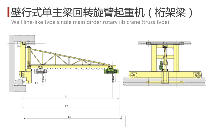 壁行式起重機(jī)按主梁結(jié)構(gòu)分為單主梁和雙主梁結(jié)構(gòu),單主梁懸臂分為固定懸臂 和回轉(zhuǎn)懸臂兩種結(jié)構(gòu)。運(yùn)行軌道尺寸可以根據(jù)用戶要求設(shè)計(jì)。